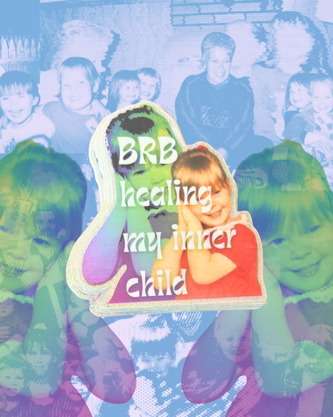Holographic sticker with "BRB healing my inner child" text and childhood photo